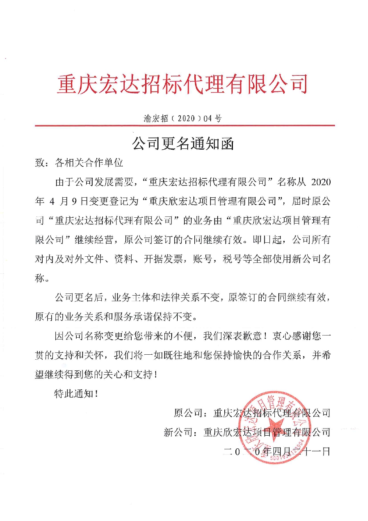 由于公司發(fā)展需要,“重慶宏達(dá)招標(biāo)代理有限公司”名稱(chēng)從 2020 年 4 月9日變更登記為“重慶欣宏達(dá)項(xiàng)目管理有限公司”,屆時(shí)原公司“重慶宏達(dá)招標(biāo)代理有限公司”的業(yè)務(wù)由“重慶欣宏達(dá)項(xiàng)目管理有限公司”繼續(xù)經(jīng)營(yíng),原公司簽訂的合同繼續(xù)有效。即日起,公司所有對(duì)內(nèi)及對(duì)外文件、資料、開(kāi)據(jù)發(fā)票,賬號(hào),稅號(hào)等全部使用新公司名稱(chēng)。 公司更名后,業(yè)務(wù)主體和法律關(guān)系不變,原簽訂的合同繼續(xù)有效,原有的業(yè)務(wù)關(guān)系和服務(wù)承諾保持不變。 因公司名稱(chēng)變更給您帶來(lái)的不便,我們深表歉意!衷心感謝您一貫的支持和關(guān)懷,我們將一如既往地和您保持愉快的合作關(guān)系,并希望繼續(xù)得到您的關(guān)心和支持! 特此通知!