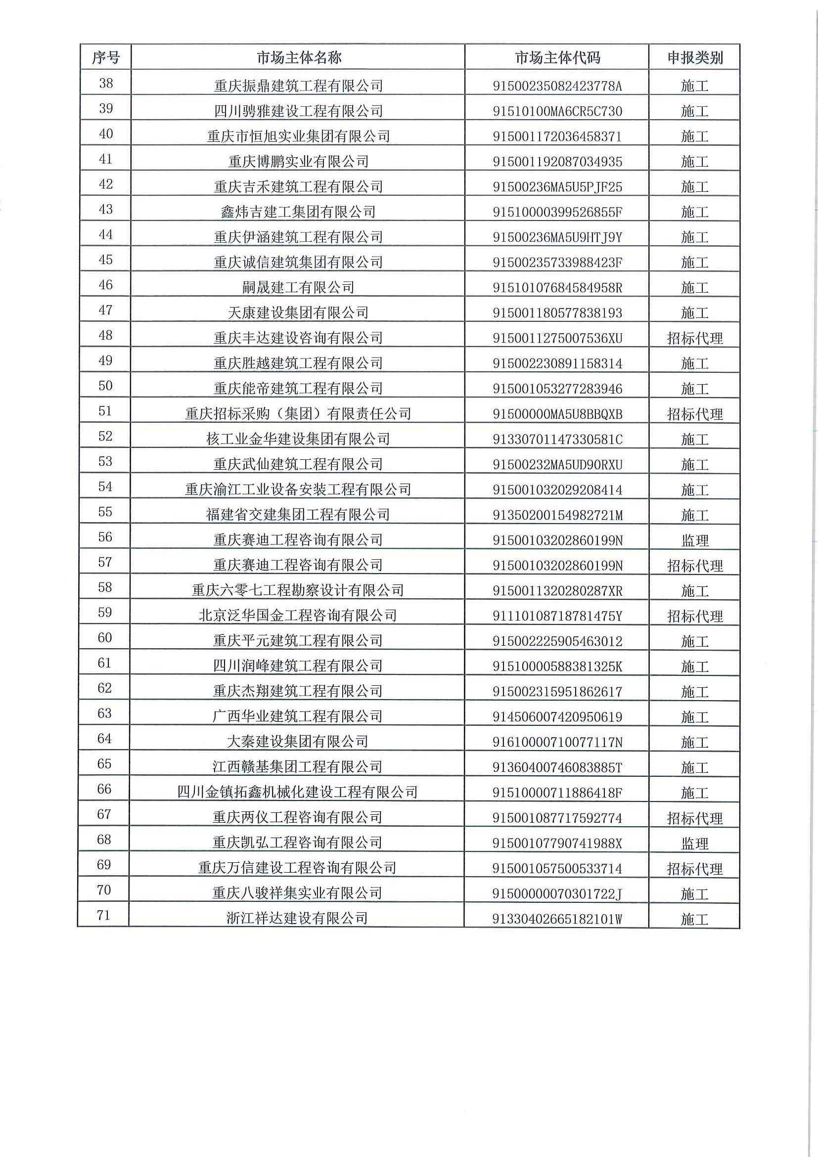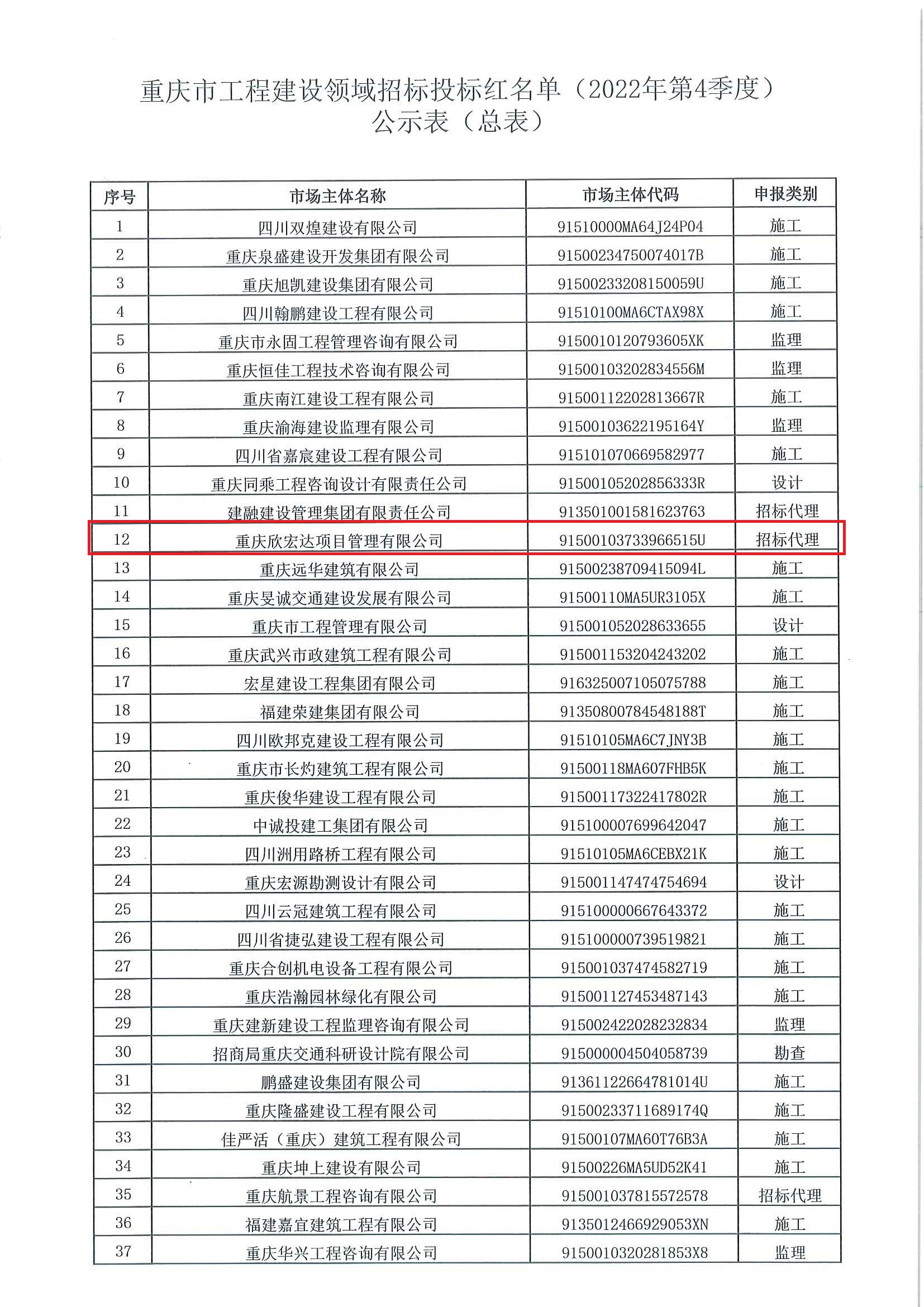 “公開、公平、公正、誠實守信”的良好信用氛圍,在全公司引導和樹立“以誠實守信為榮、以失信敗德為恥”良好風尚。下一步,公司將以此為契機,繼續加強信用體系建設,以褒揚誠信、懲戒失信為重點,切實增強誠信意識,引導和規范公司信用行為,以實際行動積極助力全市誠信體系建設,營造良好營商環境。附 重慶市工程建設領域招標投標紅名單(2022年第4季度)公示表(總表)