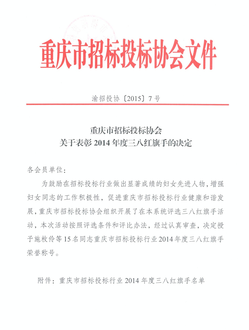 公司牟成梅同志被重慶招投標協會授予重慶市招投標行業2014年度三八紅旗手榮譽稱號